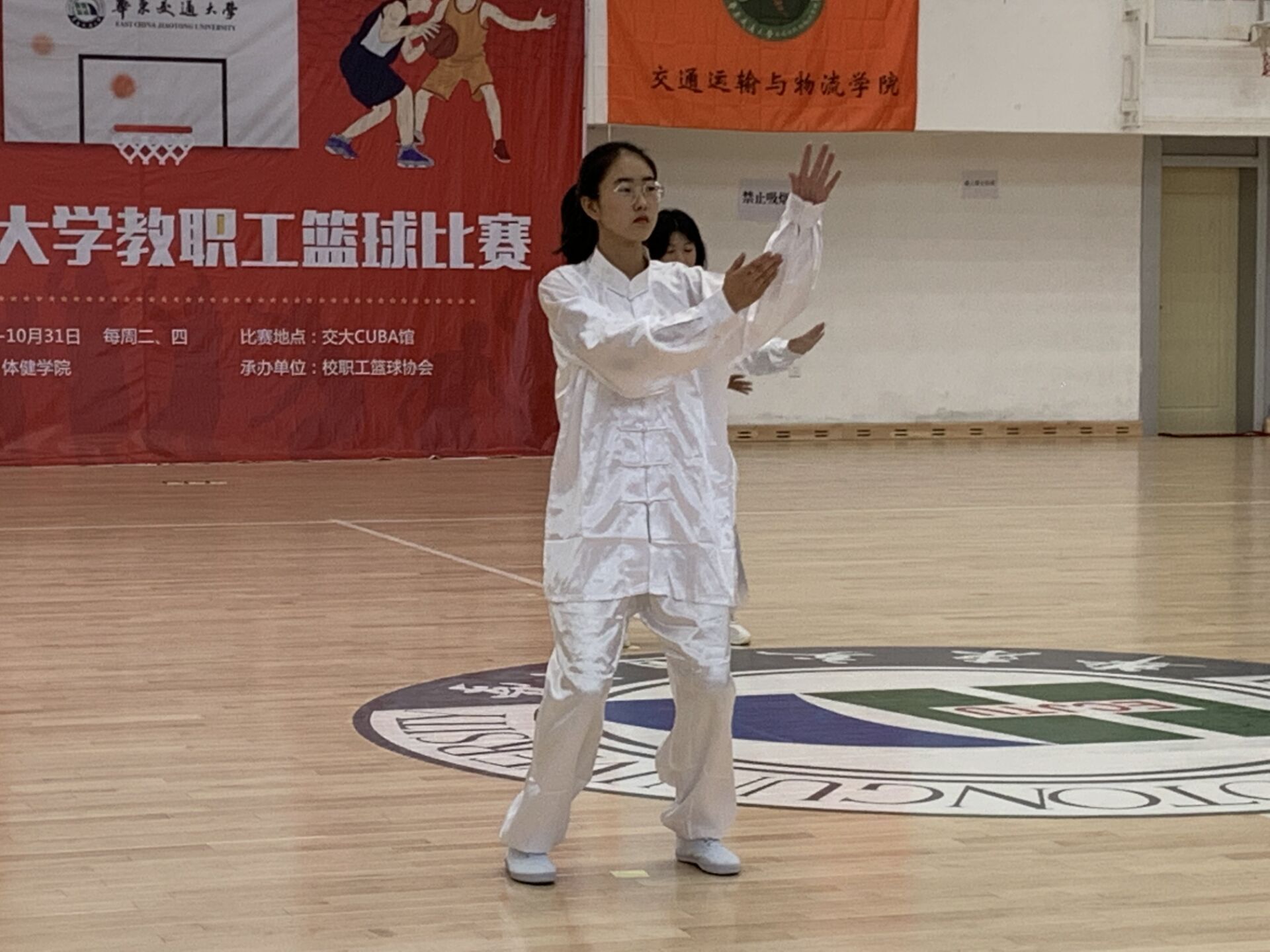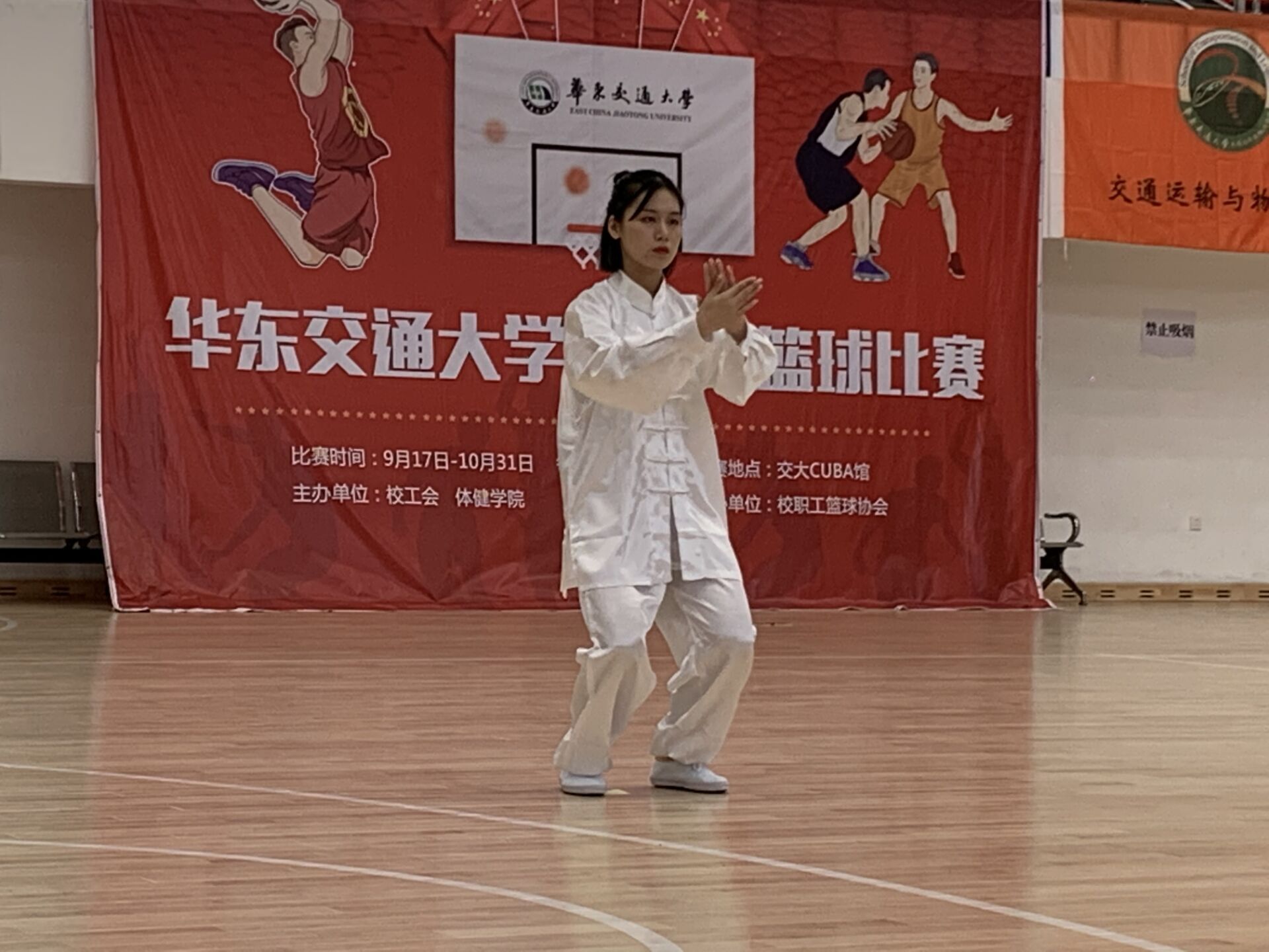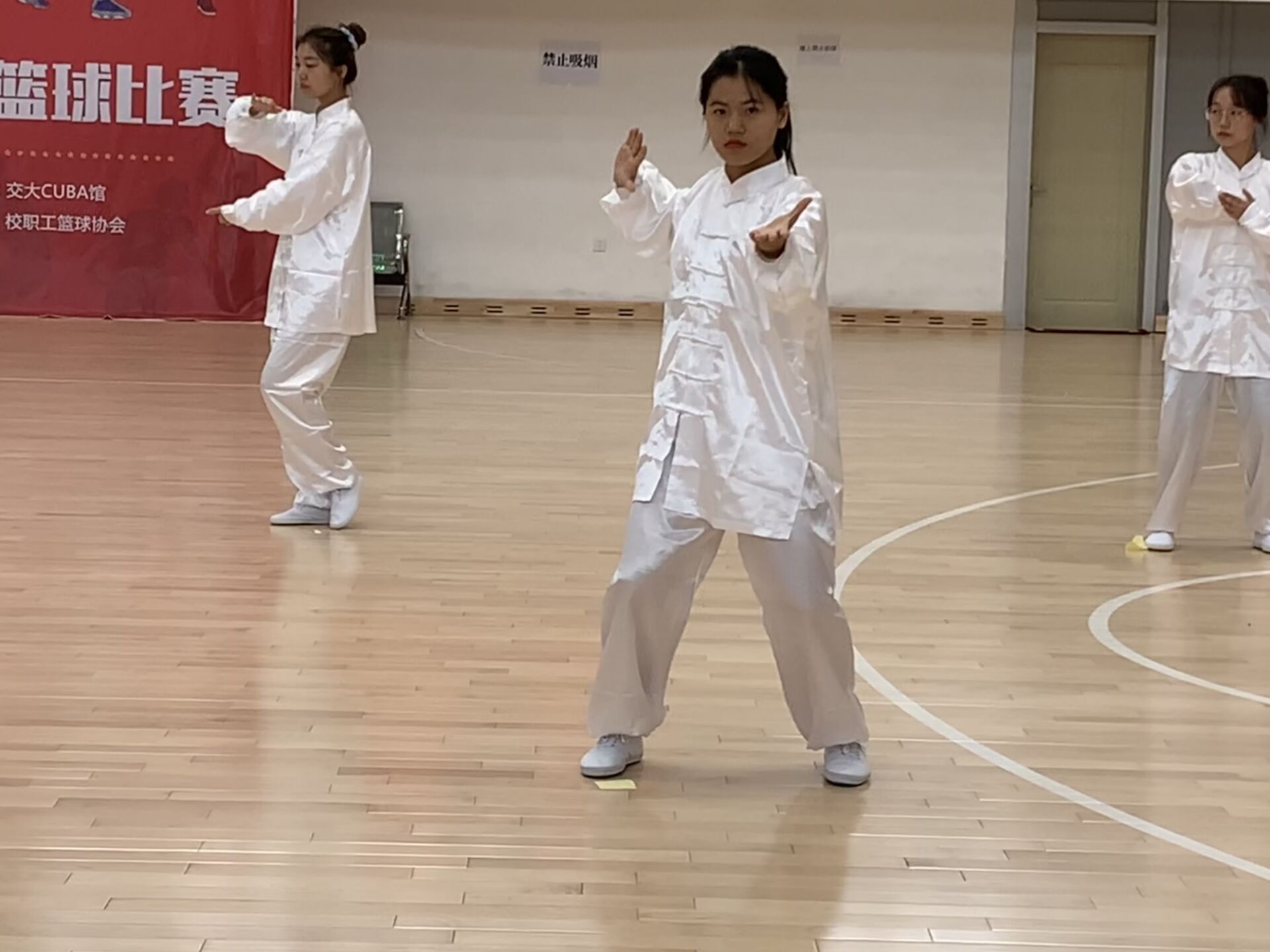 优秀的成绩源于队员们的刻苦训练,以及教练的悉心指导。自九月中旬起,每晚七点,电气楼大厅里都有他们的身影。掤、捋、挤、按、采、挒、肘、靠,进、退、顾、盼、定,八法五步的十三字诀他们早已烂熟于心。洁白的练功服伴随着标准的动作,每一步都可谓是行云流水,进退有度。抓住每次练功的宝贵时间,是他们迈向领奖台的取胜秘密。