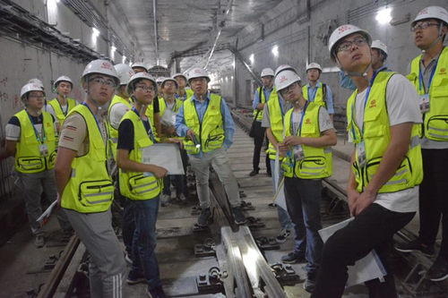 在南昌地铁2号线雅苑路地铁站(在建)工程现场,供变电、接触网、通信专业负责人结合工程实际为356体育在线官网师生认真讲解了供电、接触网、通信系统的系统构成、作用、主要设备、工序工艺等工程知识。