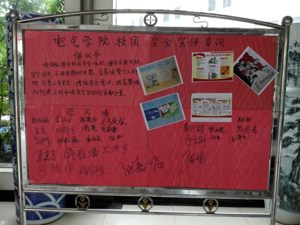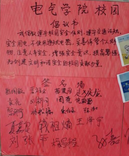 “我倡议自觉遵守校园安全准则,遵守交通法规……。”在宣读了倡议书后,现场人员开始在签名墙上签名。