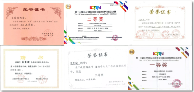 在校曾获2017-2018学年校一等奖学金,2017-2018学年校三好员工,2017-2018学年校英语演讲比赛三等奖,2017-2018学年校书画摄影大赛三等奖,2017-2018学年校艺苑杯书画大赛优等奖,2018-2019学年校一等奖学金,2018-2019学年校三好员工,2019-2020学年国家奖学金,2019-2020学年校二等奖学金,2019-2020学年校三好员工。