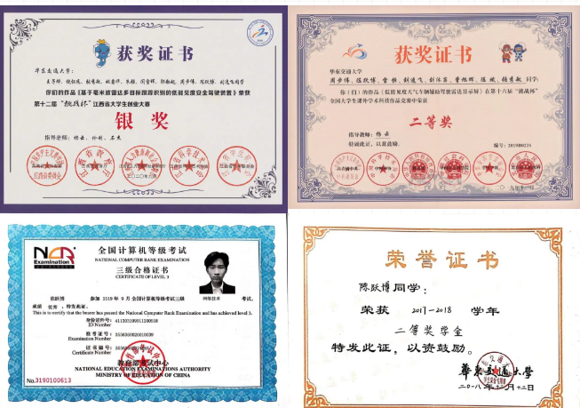 科创方面就更多了,我在参加校智能车竞赛的时候,我们队伍都是新手,看着那么复杂的电路图和程序,我的两位队友都渐渐放弃了。只有我自己从大一的时候就打算自己动手做一架智能车,不愿意放弃,开始自己学习单片机,学习AD软件,搭电路画板子写程序,这些都由我独立完成。最后的结果也出乎意料,在全校一百多架智能车中拿下了第一名的成绩。这些经历让我获益良多,也让我有了良好心态,在以后的学习生活中遇到困难总能冷静下来,认真思考解决方案。