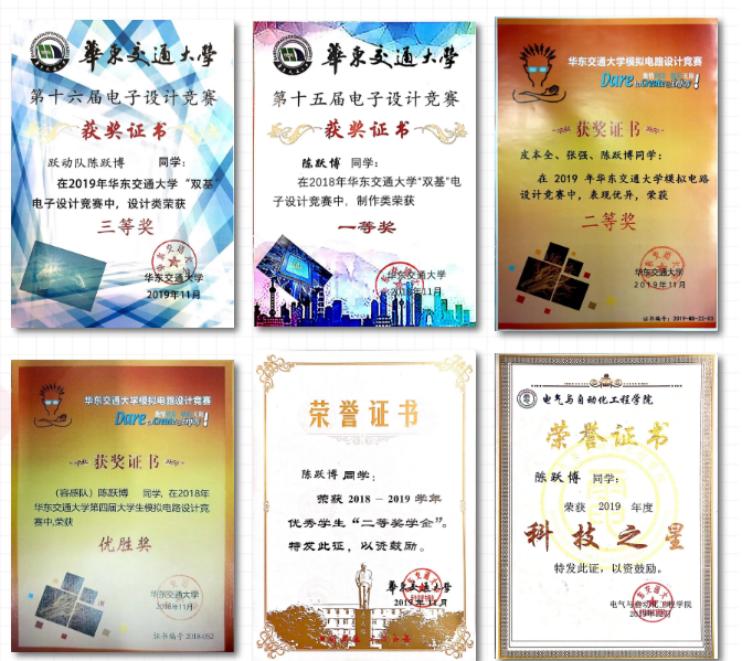 陈跃博,男,356体育在线官网,17级电气卓越班员工,学习绩点为3.94。荣获356体育在线官网356体育在线官网“科技之星”称号,曾两次获得356体育在线官网二等奖学金,获得第十六届“挑战杯”全国老员工课外学术科技作品竞赛国家二等奖、第十二届“挑战杯”江西省老员工创新创业竞赛银奖、356体育在线官网电子设计竞赛一等奖、356体育在线官网模拟电子设计竞赛二等奖,任电子创新基地国家级大创项目负责人和电子科技协会负责人。现保研至哈尔滨工业大学。