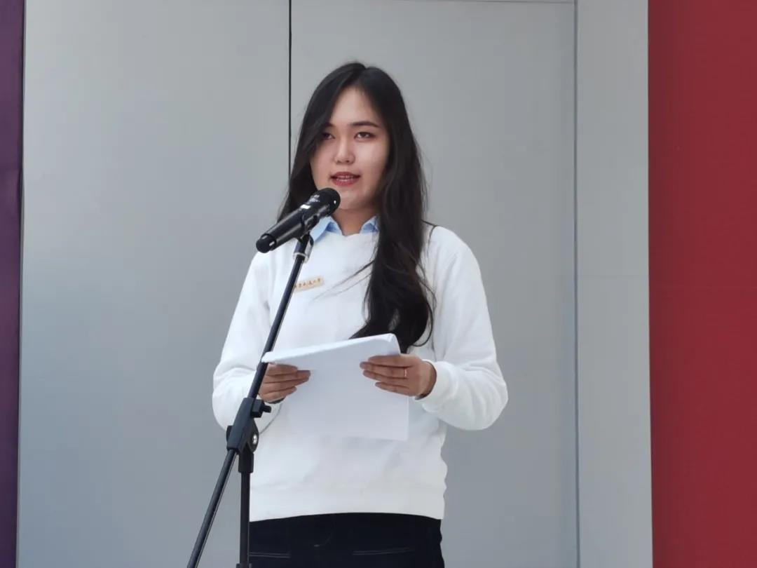 人文学院米钰洁同学作为员工代表发言,她从自身经历出发,围绕双创精神,讲述了“知产号”团队在斩获国家级一等奖、刷新公司在该赛事最高纪录的道路上所经历的故事,展现了花椒学子在求知路上团结一心、不畏艰险、知行合一的拼搏精神。