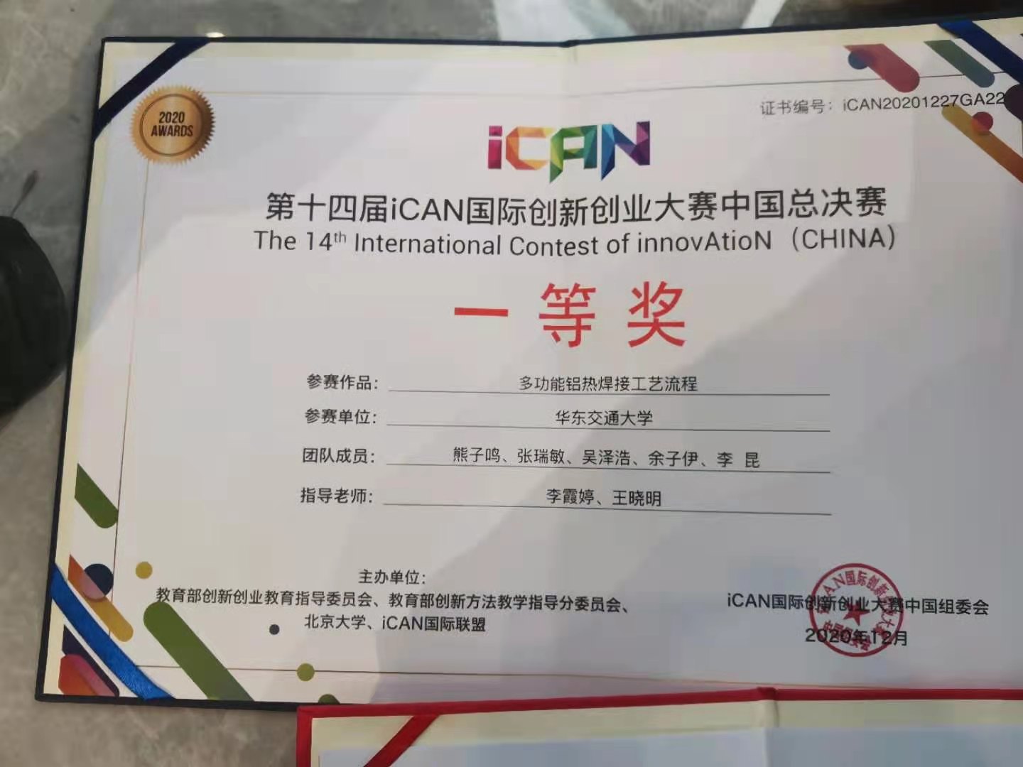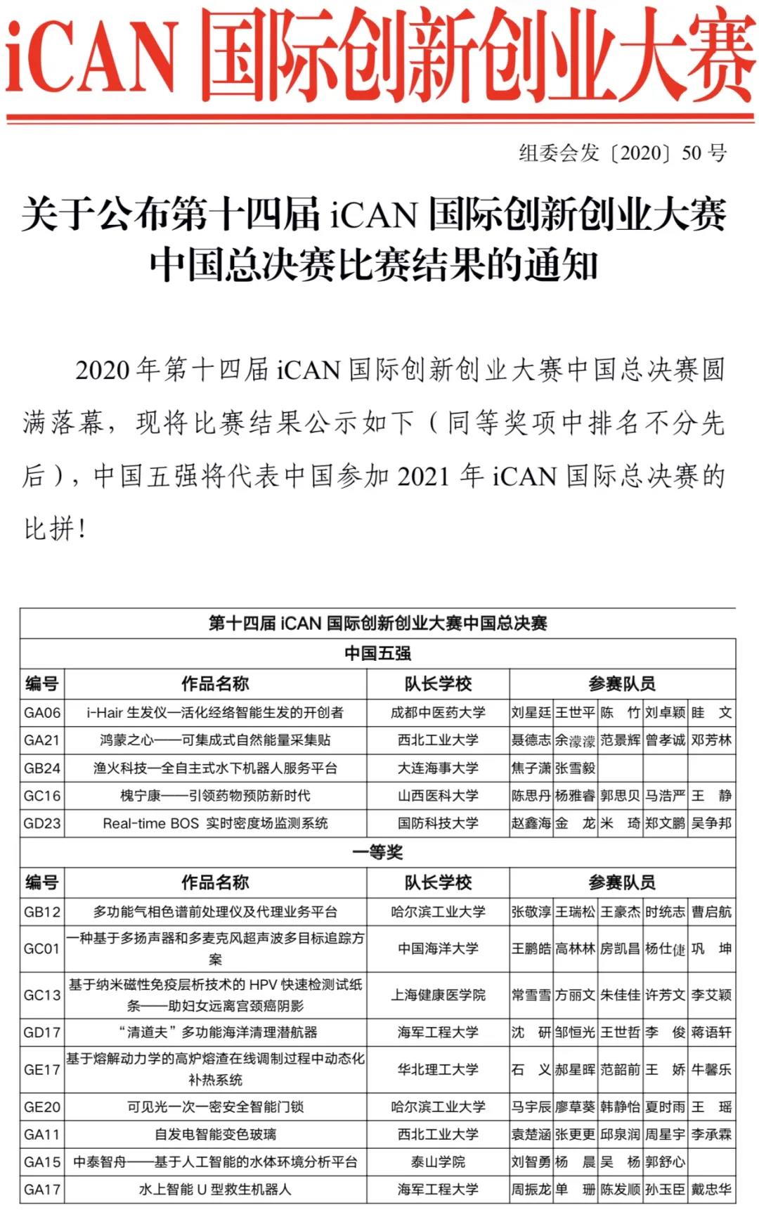 公司熊子鸣同学团队夺得2020年iCAN大赛全国总决赛一等奖!