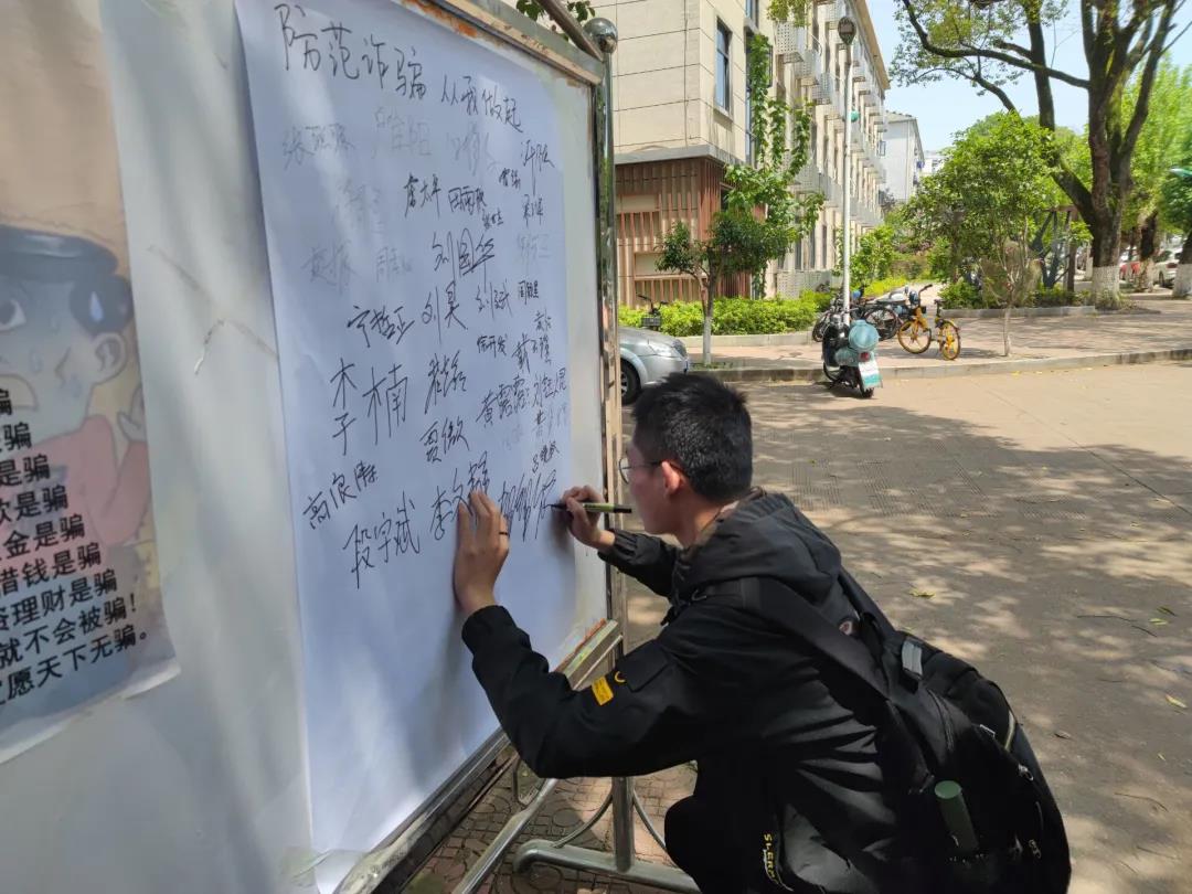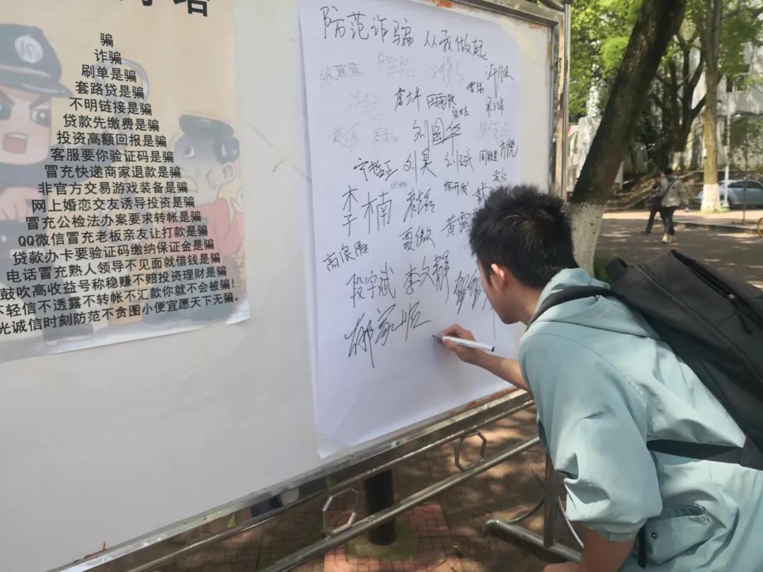 活动分为反诈知识宣传、真实案例分享、趣味答题比赛三个部分。党员们通过向周围路过的同学分发印有防诈知识的宣传单,以及分享真实的案例来提醒同学们应该提升反诈意识,在日常学习生活中提高警惕,同时在宣传结束后引导参与的同学们在反诈承诺展板上签字。通过对反诈知识的学习以及对周围近期发生的真实诈骗案件了解,同学们均表示收获颇丰,纷纷在标题为“不听不信不转账,防范电信诈骗从我做起”的展板下面签上了自己的名字。