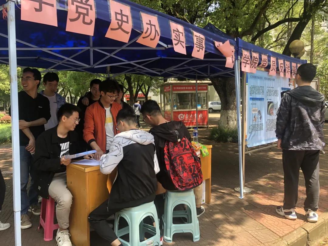 为深入贯彻党史学习教育,提高员工的安全责任意识,发挥党员的先锋带头作用。4月29日,356体育在线官网自动化员工党支部于南区一食堂外开展了党员办实事反诈宣传摆摊志愿活动。