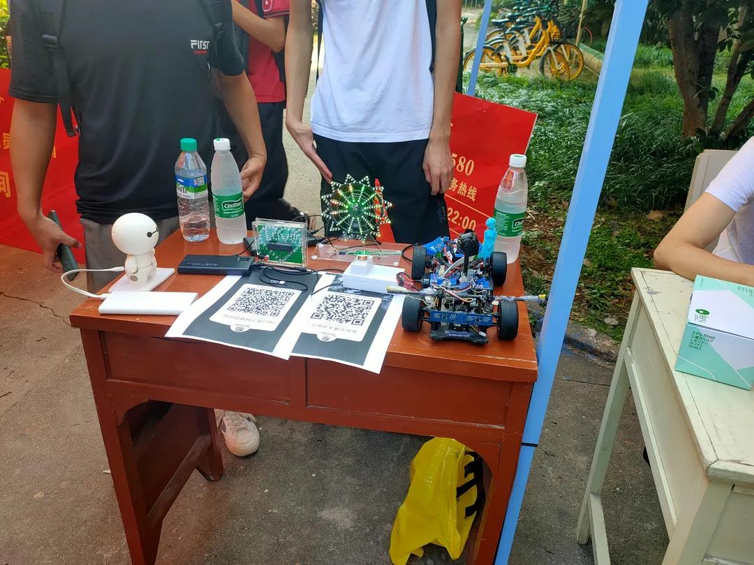为了让小萌新们直观认识科创电气,感受科技魅力,第一时间新生营造创业创业氛围,电子科技协会在每个报到点都布置了科技作品展。智能车、简易游戏机、电子时钟、广州塔、摩天轮等科技展品亮相展会,科技感十足,不免让众多华交萌新驻足观看。这些作品皆出自电气学子之手,在实践应用所学之余也能充分调动新生对专业学习的积极性和好奇心。