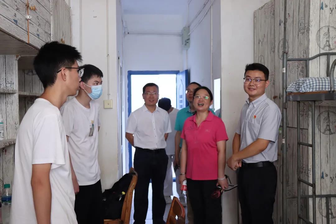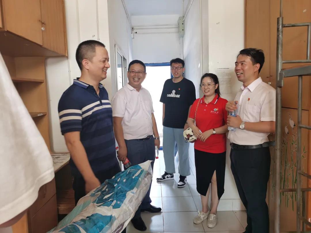 为深入了解2021级新生报到后的各项动态,听取同学们针对宿舍环境、安全防范、日常需求等方面的意见、建议,引导新生尽快适应新生活新环境,学院领导及辅导员一行走访了新生宿舍,对入住员工表达深切关怀,并亲切地与新生进行交谈,鼓励同学们尽快熟悉新环境、积极融入新班级,引导同学们养成良好的学习生活习惯,努力提高自身的综合能力。学院老师的看望与关怀让刚进入校园的同学们深切感受到了学校的温暖,小萌新们纷纷表示要好好学习,阳光生活,加强自我修养的同时积极为学院的发展建言献策。