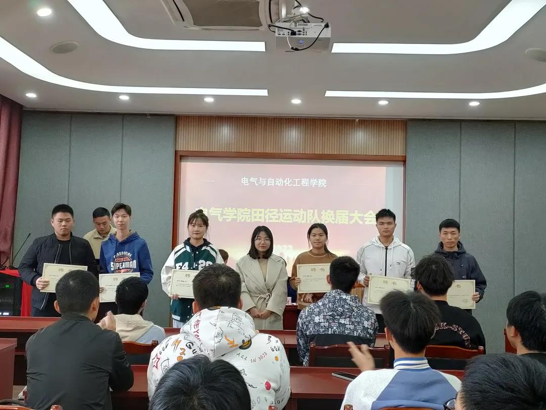 刘修财宣布杨晢将担任第十二届田径队队长,杨晨雨、吴俊成、陈晨、崔文泽、袁志成担任副队长。并由文涛为上一届田径队负责人颁发聘书,举行新老队长换届交接仪式。新老队长交接代表田径队的接力棒,场下响起激烈的掌声。
