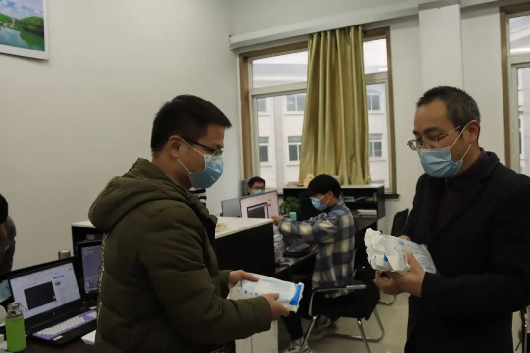 3月21日下午,公司党委书记赵敏、副经理(主持行政工作)徐雪松,辅导员武婷婷、刘锋、任家兴及带班党员们前往各员工宿舍及研究生工作室,向全院员工发放由社会爱心人士捐赠的口罩。
