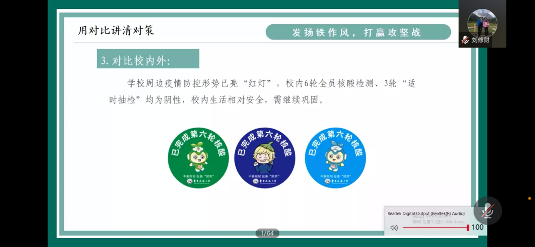 会上,柳和生主要围绕四个“讲清楚”展开疫情期间员工的思想教育。用数据讲清楚当前疫情防控形势的严峻,广大同学要继续坚持思想不放松、防疫不懈怠;用对比讲清楚当前的疫情防控政策科学有效,学校各项规定是紧扣政策、没有加码的;用问答讲清楚学校各项规定的初衷,重点解决员工关心关切问题,说明学校疫情防控成效;用案例讲清楚触犯校园“15+8”疫情防控规定的严重后果,明确各项规定的处分等级。