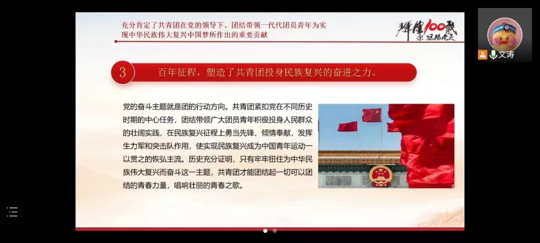 会议尹始,文涛老师给全体团员青年带来一堂“深入学习贯彻习近平总书记在庆祝中国共产主义青年团成立100周年大会上的重要讲话精神”专题团课。她从“全面回顾100年来共青团坚定不移听党话、跟党走的青春历程”、“充分肯定了共青团在党的领导下,团结带领一代代团员青年为实现中华民族伟大复兴中国梦所作出的重要贡献”、“深刻阐明了共青团和青年工作的历史经验”、“对当代青年寄予殷切期望” 、“对做好新时代共青团工作提出的明确要求”5个方面进行了阐述。中华民族始终有着“自古英雄出少年”的传统,青年始终是推动中华民族勇毅前行、屹立于世界民族之林的磅礴力量。广大团员青年要树立远大理想、热爱伟大祖国、担当时代责任、勇于砥砺奋斗和练就过硬本领,以实现中华民族伟大复兴为己任,不辜负党的期望、人民期待。