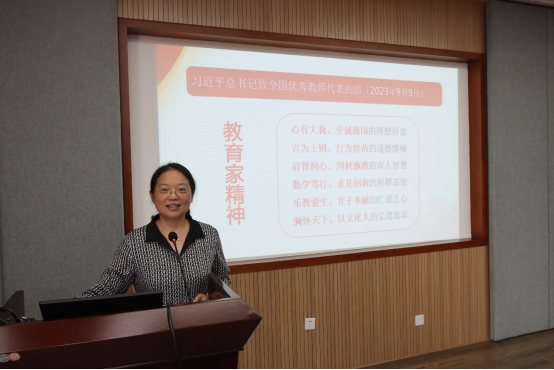 会上,赵敏带领全体教职工学习了习近平总书记致全国优秀教师代表的信、习近平总书记在中共中央政治局第五次集体学习时的重要讲话精神以及《新时代高校教师职业行为十项准则》等,她强调,师德师风是教育工作者的灵魂,在我国从教育大国向教育强国迈进的关键阶段,所有老师要深刻认识在教育强国、科技强国、人才强国建设中肩负的光荣使命与重大责任,要以教育家为榜样,弘扬培育践行教育家精神,牢记为党育人、为国育才的初心使命,坚守三尺讲台,潜心教书育人,争做“四有好老人”和“四个引路人”,争做员工为学、为事、为人的“大先生”,努力培养更多德智体美劳全面发展的社会主义建设者和接班人。