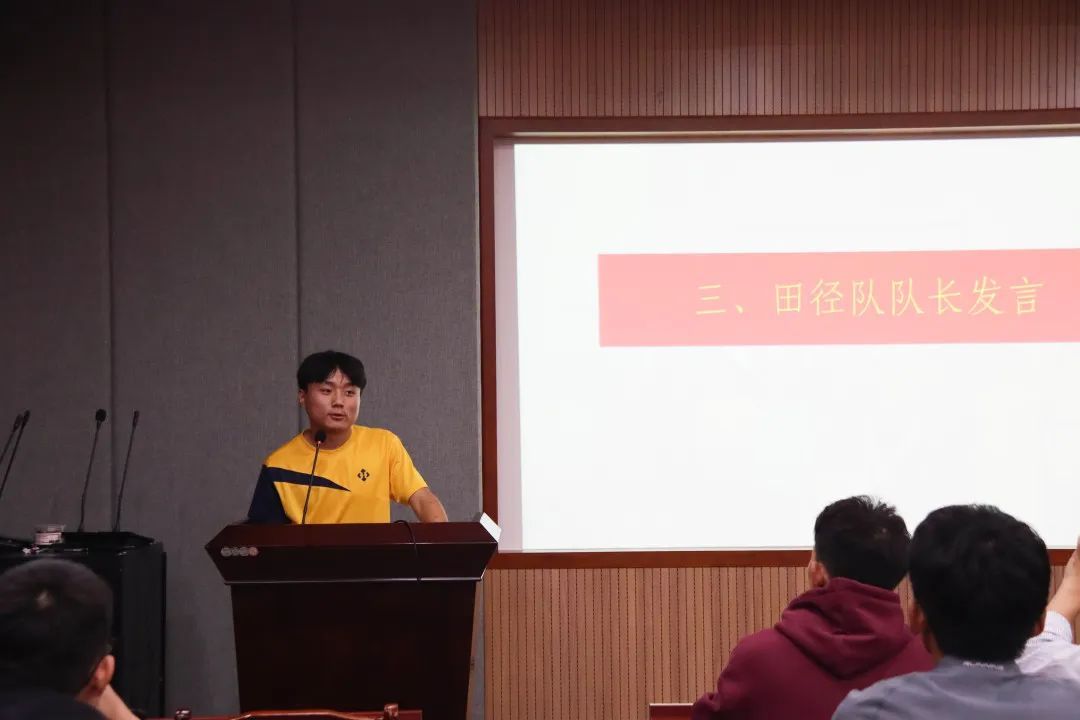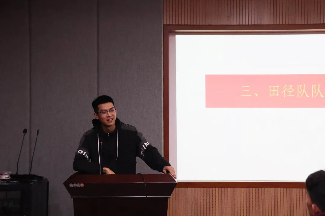 视频播放结束后,由田径队队长张自超发言。他首先代表全体田径队队员向学院领导和老师的到来表示衷心的感谢。张自超对田径队的同学们加油打气,通过一次次集训,大家都做出了十二分的努力,我们有信心能展现最大的实力。同时大家还要保持良好心态,去迎接即将到来的比赛。