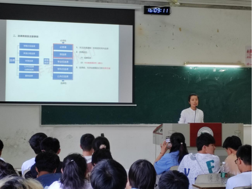 黄琴老师向大家介绍了教务系统,包括选课类别、注意事项和培养方案(智能化培养方案、专业教学计划表、专业培养方案细则)、修读情况、学籍异动、员工选课等,并特别强调在选课之前要仔细查看培养方案,全面了解所需课程和学分要求。选课时间内可以进行退改选操作,但选课时间结束后无法再进行退选。