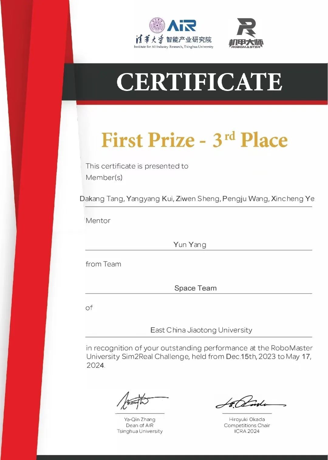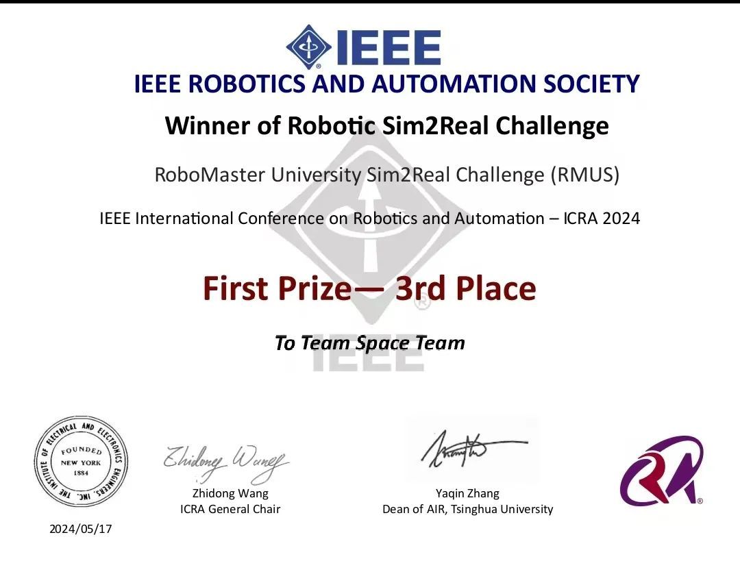 近日,ICRA 2024 RoboMaster机甲大师高校Sim2Real挑战赛(RoboMaster University Sim2Real Challenge,简称RMUS)总决赛在北京顺利闭幕。356体育在线官网356体育在线官网电子创新基地的参赛队伍,包括唐大康、隗洋洋、盛子文、王鹏举、叶新铖五位同学,在杨云老师的带领下,与来自天津大学、中国科学院大学、哈尔滨工业大学(深圳)、东北大学、北京理工大学、等117所名校学子展开激烈角逐,首次参赛表现优异荣获第三名,获得本次竞赛的一等奖。