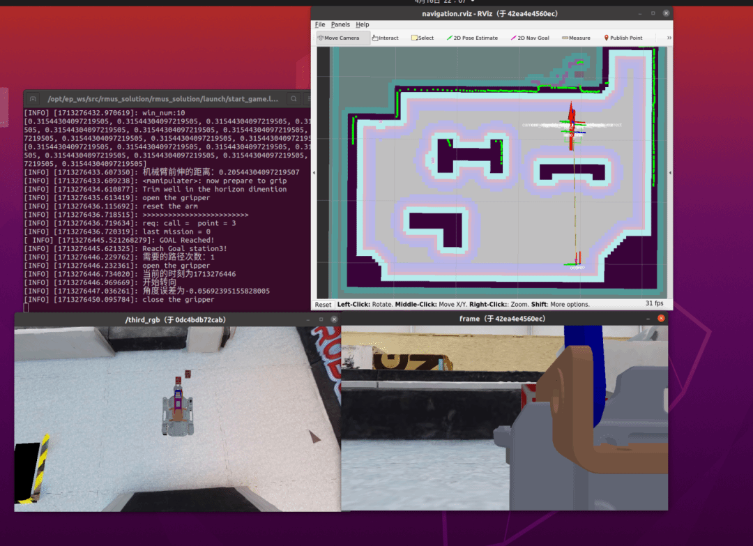 RoboMaster 机甲大师高校Sim2Real挑战赛(RMUS)是由清华大学人工智能产业研究院(AIR)、RoboMaster组委会、全球机器人和自动化大会(ICRA 2024)联合举办,旨在通过仿真提高真实世界中机器人完成感知、导航和操作等任务的性能,为全球科技爱好者提供云端可部署的机器人数字孪生平台,加速机器人领域的科研进展。与传统机器人比赛不同,参赛机器人为经过官方改装的RoboMaster EP机器人,要求全自动运行。参赛队伍需要使用官方提供的Docker镜像通过Habitat平台和云场地进行代码设计、仿真调试,完成矿石兑换任务,并按规定时间线上提交比赛代码,官方人员将代码部署到对应的实体机器人中,以测试程序的实际运行效果,远程进行线下比赛。