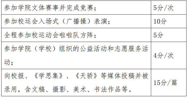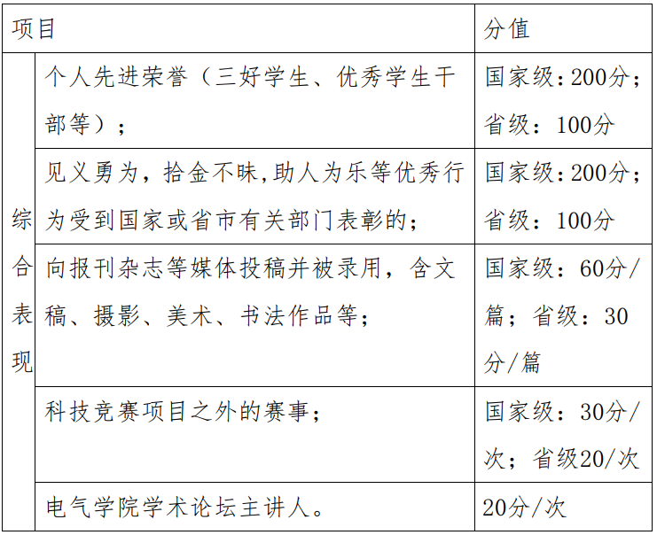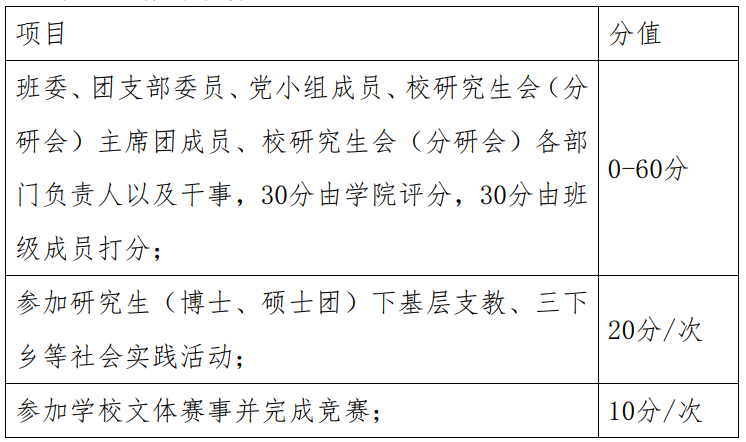 参与重要社会工作,取得相应成果或获得相关荣誉可以加分。统计截止时间为发布评奖通知的上个月末。获得多项荣誉,只记最高项,具体加分方式见下表: