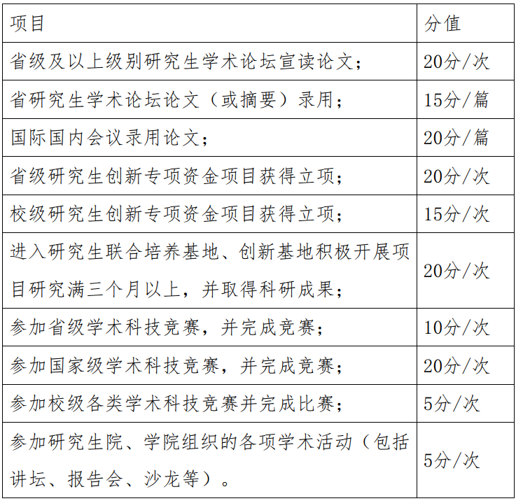 依据研究生平时行为因素进行评定。统计截止时间为发布评奖通知的上个月末。按下列分项成绩进行累加: