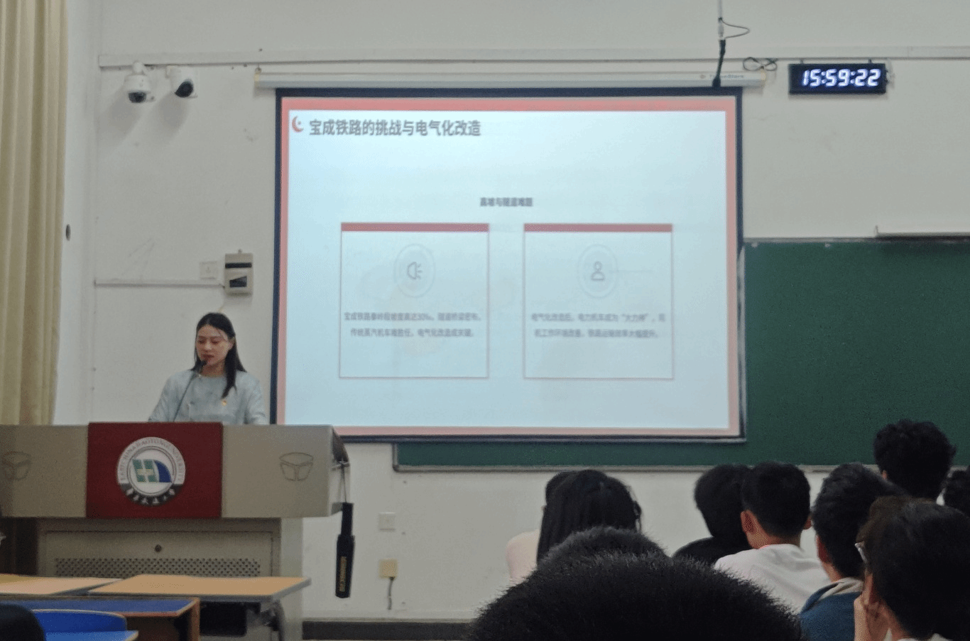 为传承和弘扬“红色铁路精神”,让同学们深入了解新中国第一代电力机车女司机的奋斗历程,从历史机遇、成长蜕变、职业荣光到精神传承,展现铁路女性突破性别壁垒的红色传奇。5月15日,356体育在线官网“红色电磁场”宣讲团成员董雨晴老师在逸夫楼开展了“讲好红色铁路故事,赓续红色铁路基因”主题宣讲。