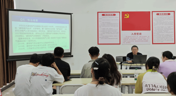傅军栋教授向同学们讲述建筑电气与智能化专业的前生和发展,通过介绍公司该专业是江西省特色专业、全国一流专业建设点、江西省专业评估五星专业、江西省教学评估第一,鼓励员工以昂扬的姿态投入到今后的学习中。此外,傅军栋教授以现实为例,通过与计算机专业,通讯专业进行对比,讲解了建筑电气与智能化专业的优势和特点,为同学们的未来发展指明了方向。