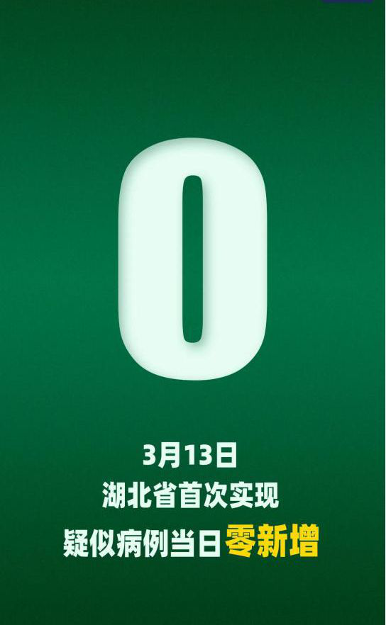 数据显示,截止到3月11日,湖北新增病例首次降至个位数。中国国家卫生健康委员会新闻发言人、宣传司副司长米锋表示,3月11日武汉新增病例8例,已经降至个位数,湖北除武汉以外,所有地级市已连续一周无新增确诊病例,湖北以外省份,新增确诊病例7例,其中6例为境外输入病例。截止至3月13日,湖北省新增确诊病例清零,跨出新冠肺炎抗战的一大步。