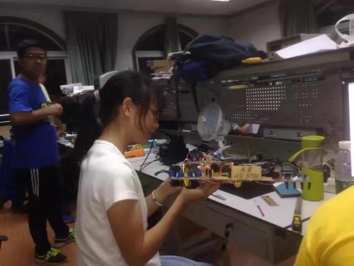 大学期间,她加入了电子科技协会,在这里,她认识了一大批精通算法、硬件和软件的大神。“我看到有人拿着锉刀,看着学习视频,然后一磨就是一上午,只为了磨出一个圆润光滑的角度,这样子板子装在智能小车上能更漂亮,甚至连一个小小的铜柱都不放过”,她回忆道,“男生总是会有这种别样的执著”。他们吃苦耐劳的精神,现场调试,不解决问题不罢休的决心也深深影响了她。她开始慢慢活跃于科技竞赛,从双基电子设计大赛、电子制作大赛到智能车比赛,她跟随着小伙伴们的脚步,一点一滴的从敲代码、画板子、用电钻开始。“在电协,从来不觉得自己厉害,但也从不怕迷失方向,因为她可以看到更强大的人在前方。”