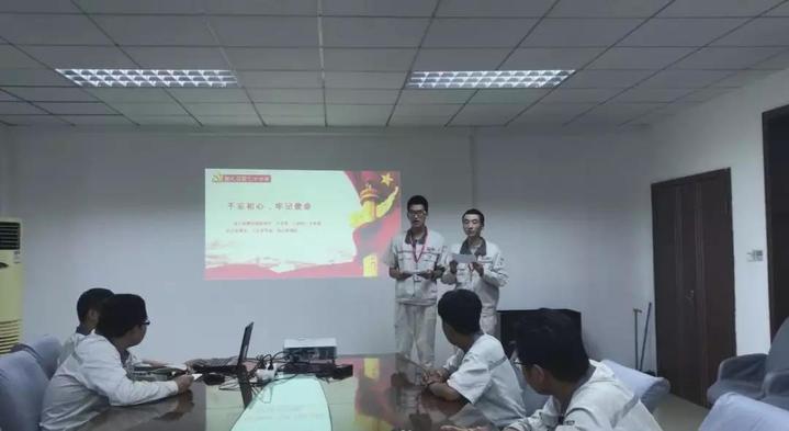 献礼祖国七十华诞,展现花椒党员风采。我是花椒员工党员李海宁,我是花椒电气员工党员叶美瀚。很高兴能在中车株机电气设备分公司交验车间实验班开展献礼祖国七十华诞的宣讲,我们今天的宣讲主题是“守初心、担使命、忆过去、再出发”