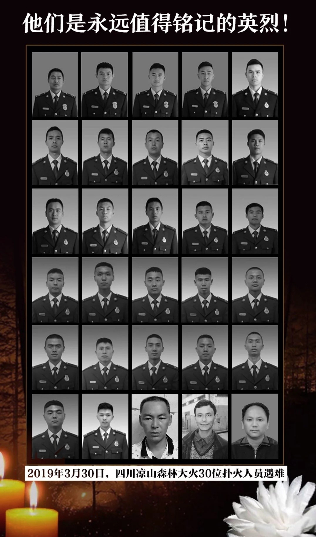 33018时许,四川凉山州木里县雅砻江镇立尔村发生森林火灾,331日下午,扑火人员在转场途中,受瞬间风力风向突变影响,突遇山火爆燃,形成巨大火球。27名森林消防指战员和3名地方扑火人员失联,截至411830分,30名扑火队员的遗体已全部找到。42日下午,他们的名字和照片,留在了一张张黑色的底板图片上。27名消防员中,180后,2490后,200后,最小的还不满19岁。这是一组多么令人痛心的数字,那么多鲜活的生命突然消失了.....