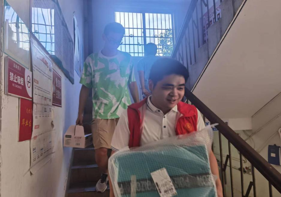 “同学,我来搭把手吧”身着红马甲,胸配党徽,党员志愿者在楼栋亮明身份,积极服务,从宿舍到楼底,到货车,再到教十栋的教室,每一个环节有条不紊地进行着,每一处都能看到一道道红色的身影。