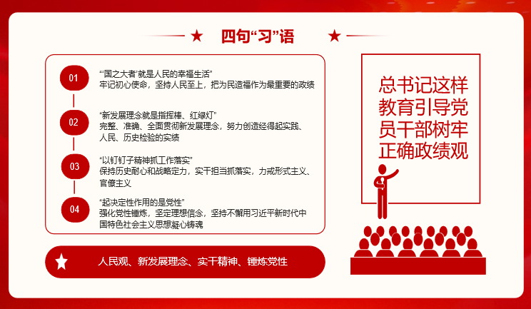 围绕“‘国之大者’就是人民的幸福生活”“新发展理念就是指挥棒、红绿灯”“以钉钉子精神抓工作落实”“起决定性作用的是党性”四句“习语”,李梦影对什么是正确的政绩观、如何树立正确的政绩观进行介绍分享。