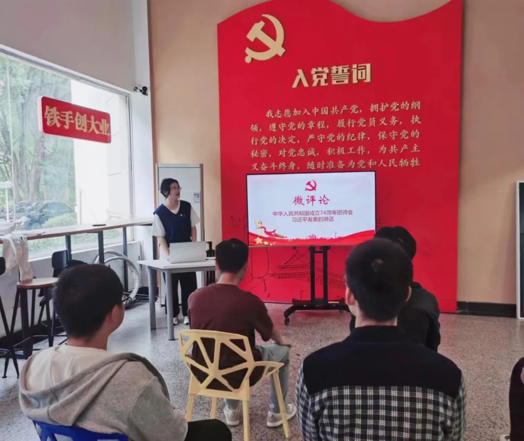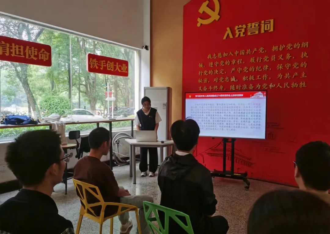 2023年10月26日,电气科创员工党支部在三化平台开展“学习中华人民共和国成立74周年招待会上的讲话精神”主题五微活动