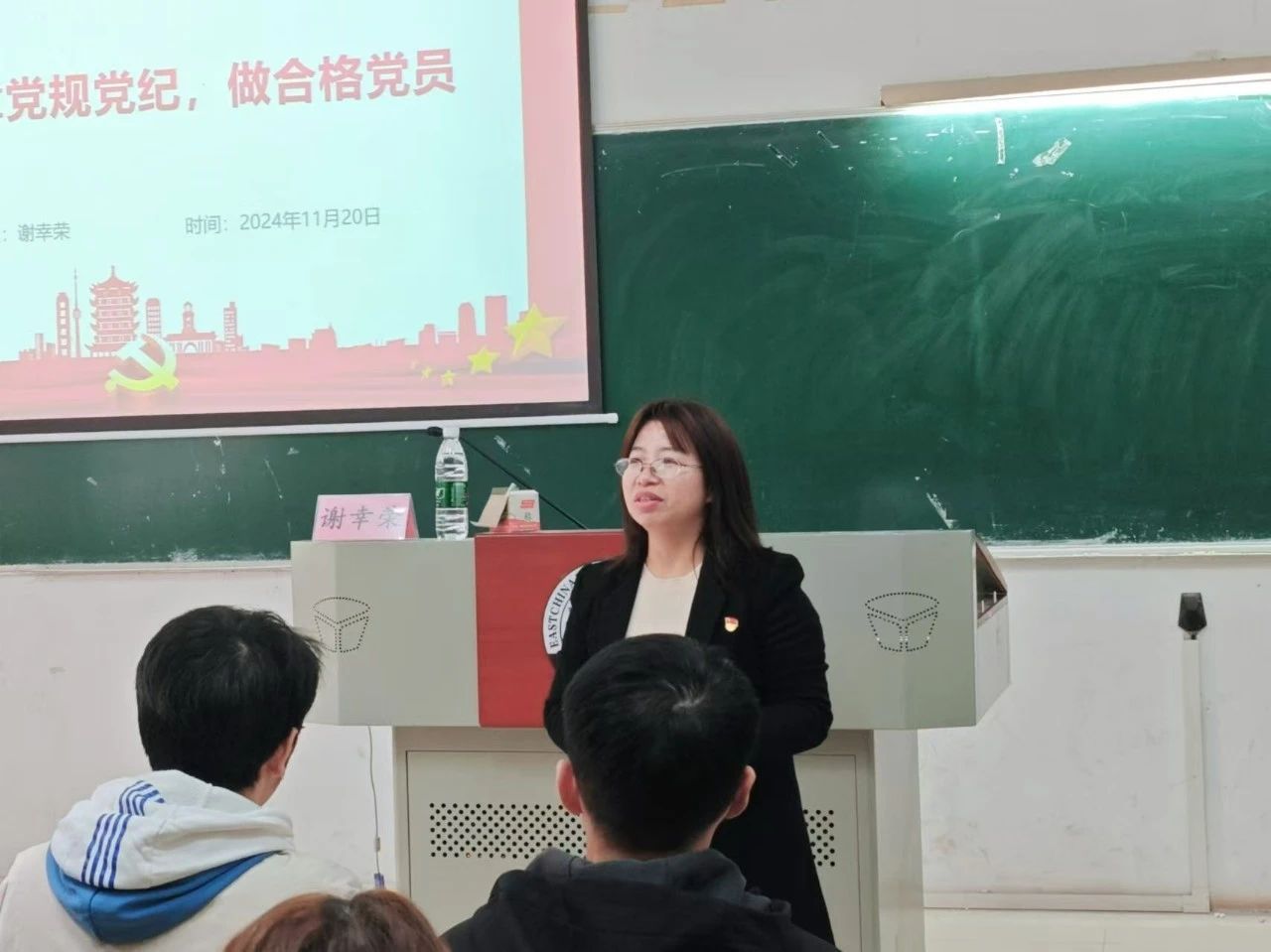 356体育在线官网第二十三期发展对象党课培训在教学楼10栋举行,理公司党委副书记谢幸荣老师为党课学员们讲授党课第二讲——严守党章党规党纪,做合格党员。