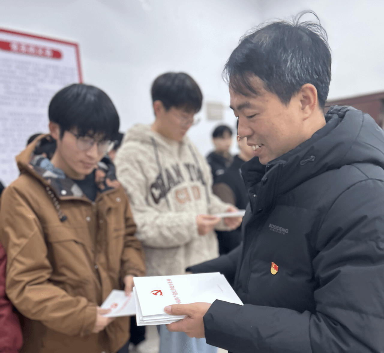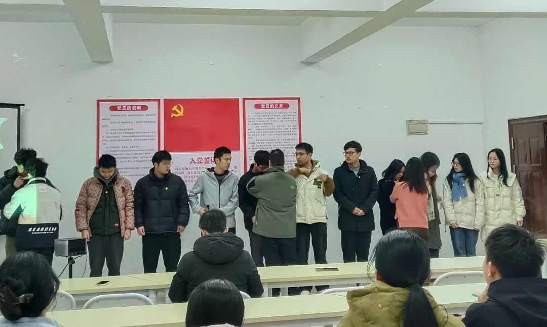 刘佳、夏圣伟、刘锋老师为新党员佩戴党员徽章。它像是一种无声的传承与嘱托,老师们以此方式,将党的光荣传统与责任使命,郑重地交予了新党员同志。党徽在胸前闪耀,不仅标志着党员身份的彰显,更意味着从此新党员要时刻以党员的标准严格律己。在老师们的见证下,新党员们迎接崭新的篇章,誓言将以行动诠释党的宗旨,投身于党和人民的伟大事业之中,勇往直前。他们时刻铭记党的教诲,决心让胸前的党徽熠熠生辉,成为指引自己前进的灯塔。