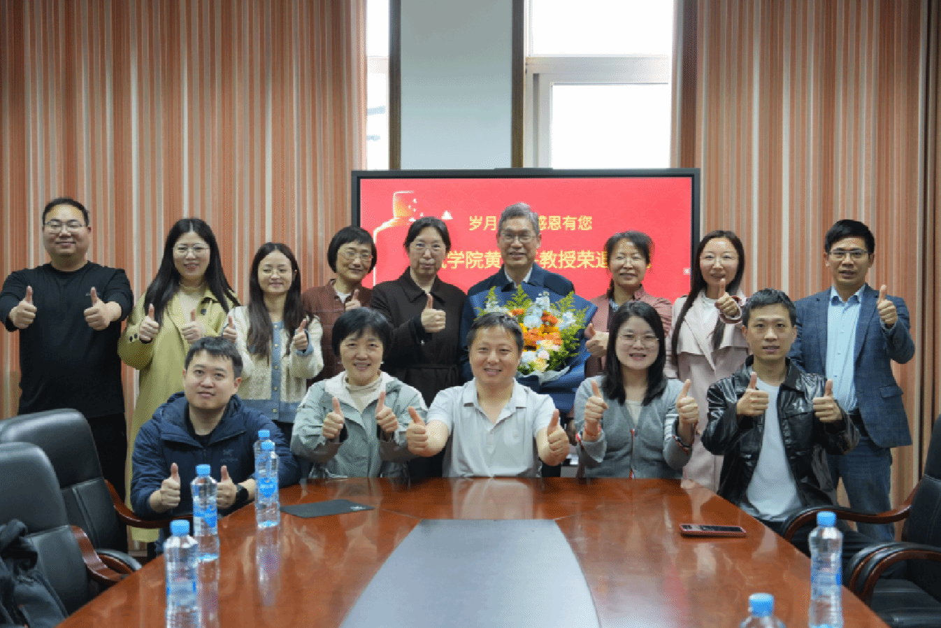 随后,经理李泽文代表学院为黄教授献上鲜花,致以最诚挚的感谢与最温暖的祝福。全体教研室老师与黄教授一同合影,定格这温馨难忘的瞬间。