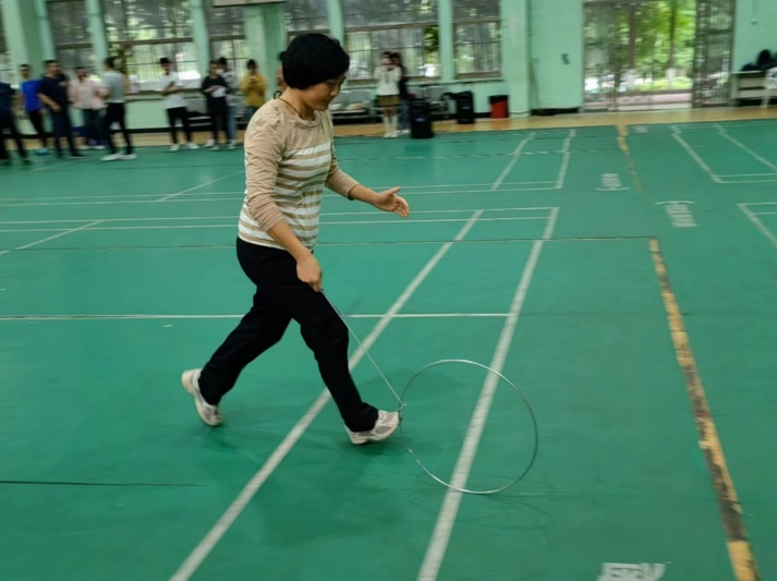 滚铁环接力环节,每队人按顺序排好队站立于起点,滚铁环跑到对面,绕小桶返回,然后其它队员依次接上,直至所有队员都跑完,按时间先后进行排名。老师们动作流畅敏捷,铁环在地上滚滚而行,快乐在围成的圆圈内不断传递,仿佛回到了童年时代,找回了那份纯真和快乐。