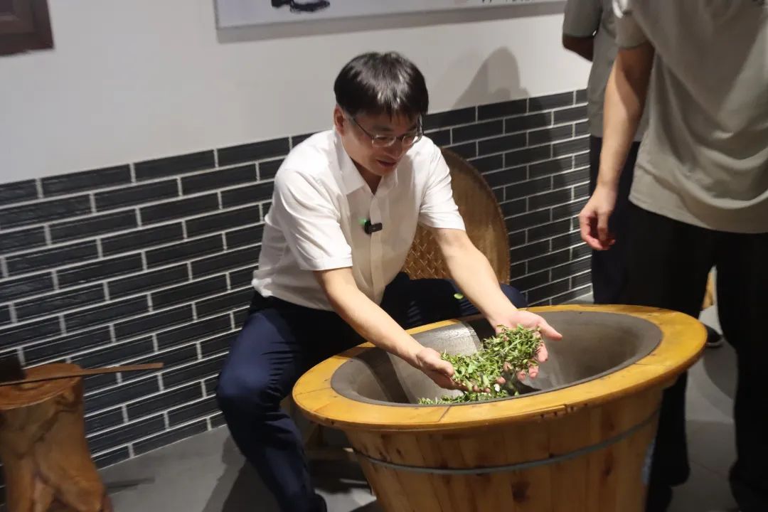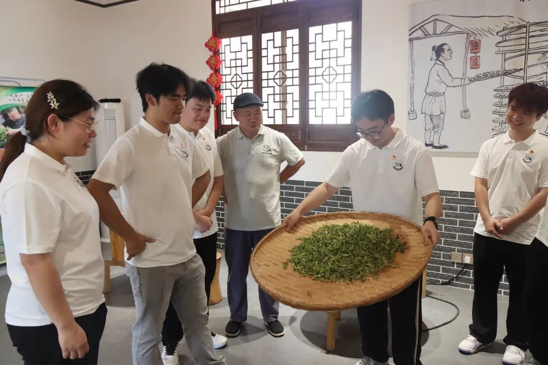 在海庐茶博园室外茶园,欧阳志刚与实践队队员亲身体验茶叶采摘过程,并在国家级科技小院参与茶叶摊青、杀青、揉捻、烘焙等非遗制茶技艺,沉浸式感受茶文化魅力。