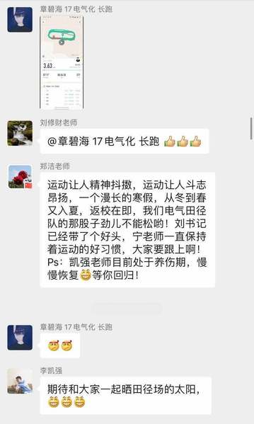 学工办主任兼团委书记郑洁也指出,锻炼让人精神抖擞,运动使人斗志昂扬,这是一个漫长的寒假,从冬到春又入夏,但现如今返校在即,望公司田径队始终坚持着运动时的干劲,保持经常运动的良好习惯。辅导员李凯强也表示,期待与各位同学一起晒田径场上的太阳。