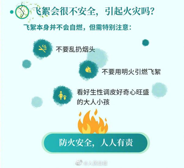 一不要随意在野外点燃柳絮;二是不要将火源放在孩子能够到的地方;三是户外吸烟时烟头要完全熄灭再丢弃,防止火星飞落,引燃柳絮;四是及时清理家中、院中积攒的大量柳絮,以免将其引燃。