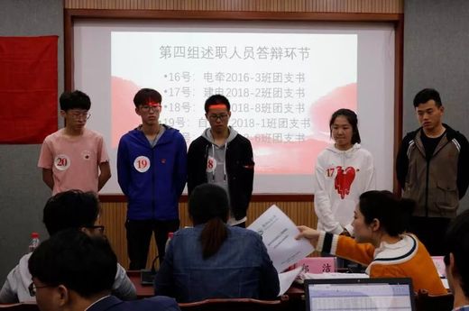 会中,公司部分班级团支部团干部代表进行述职,并由郑洁老师、苑莹老师、王新越、龚钰卓进行问辩、评分。