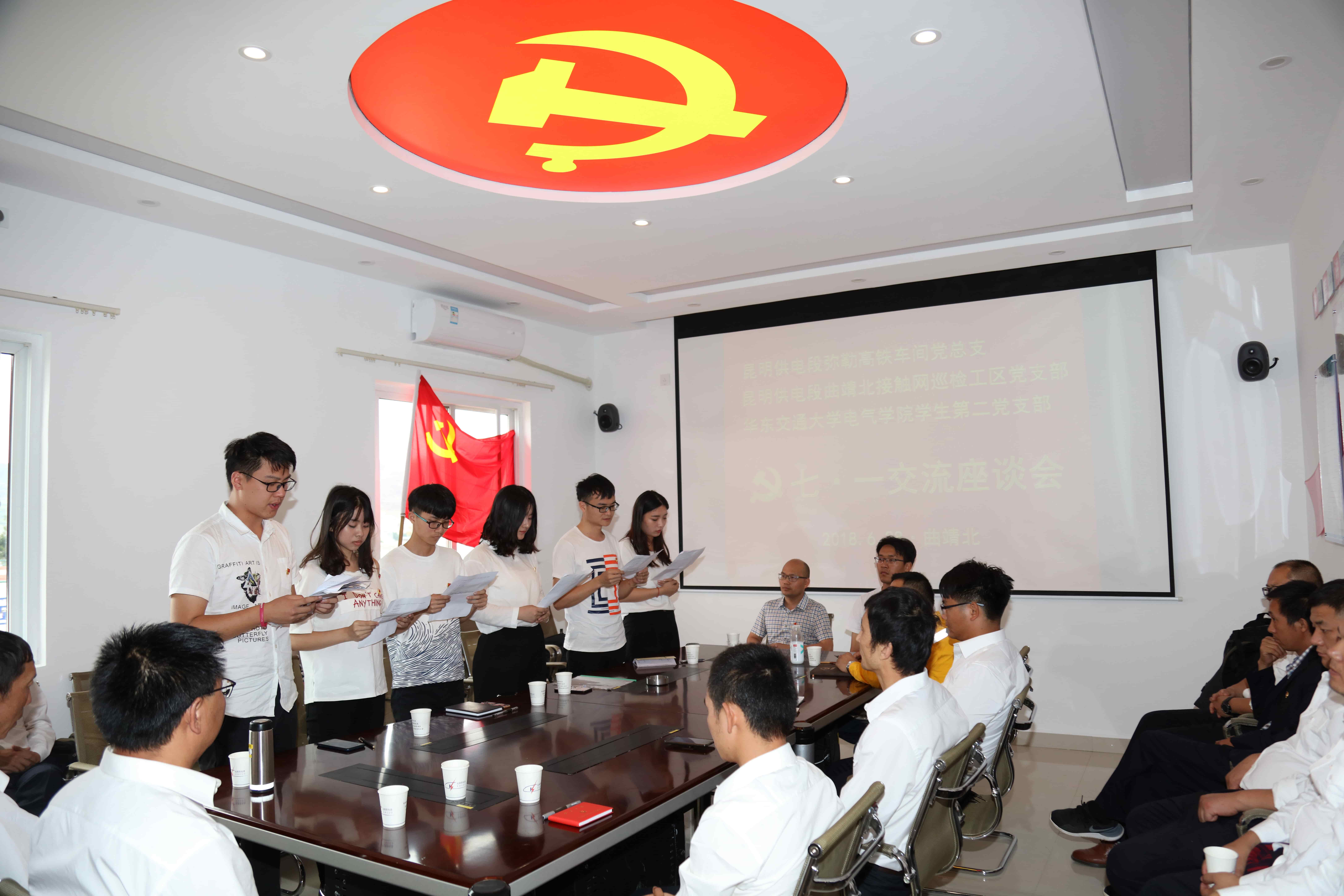 同日,在外实习的356体育在线官网员工第二党支部的六名员工党员同昆明供电段弥勒高铁车间党总支、昆明供电段曲靖北接触网巡检工区党总支共同举行“七一”系列党建活动,公司电气化党支部朱建勇老师出席。
