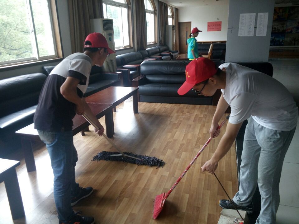 走廊上的壁画、活动室的台球桌、舞厅的地板、摆放饮水机的桌子……29名“小红帽”按楼层行动分为四队,紧张有序的投入到劳动中。窗户和木椅清理的难度较小,但一部分会议室和娱乐室,由于不经常使用,许多地方有顽渍,让志愿者很难下手。男同学主动拿起扫帚和拖把,把水洒上,边扫边拖,终于把顽渍清除;女同学紧跟其后,用报纸蘸干水渍。大家干劲十足,跑上跑下,累的满头大汗,但又忙的不亦乐乎。