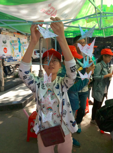 “九九重阳,希望奶奶长寿健康!”、“外公,您的风湿病还常犯吗?”、“奶奶,我好想你,寒假回去,您一定要好好的!”……满载着寄语的各色纸鹤随风摇曳,输送着对亲人的思念。展板上有同学与家中老人的温馨定格,也有汇集着个人创意的手绘。每一个作品都承载着浓浓的情意,感染着每一位围观者,纸张巧妙拼呈“久”字形,也寓意“长长久久”。