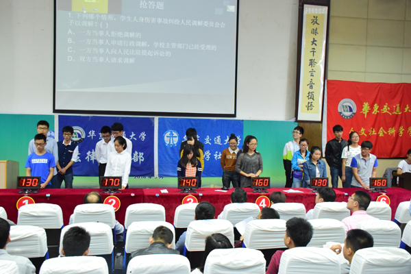 本次比赛在单项环节内增设了分数上限,对选手的综合能力提出了更高的要求,一度使得比赛陷入胶着状态。从检验选手法律基础知识的必答题,到挑战选手心理素质的抢答题,再到考察选手团队配合的成语接龙题,各参赛队伍展现出自己良好的精神风貌。各支队伍旗鼓相当的实力,让比赛如戏高潮迭起。