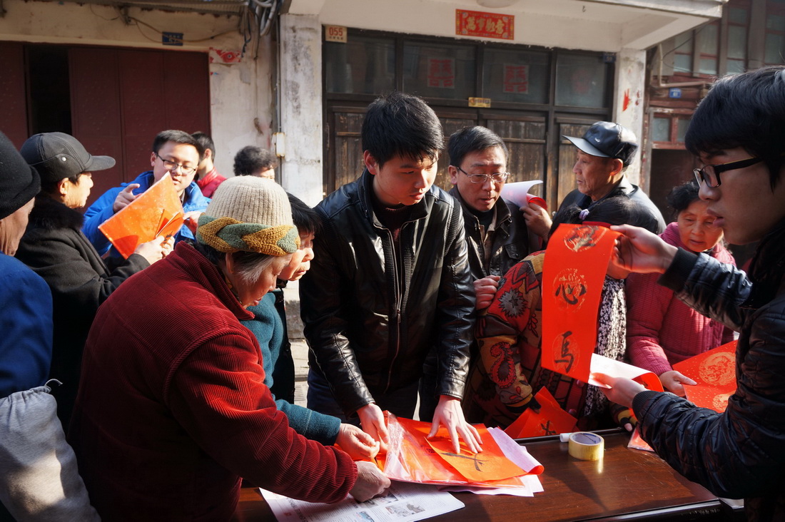 志愿者们提前书写了60副对联和20张福字,可社区居民的热情却是始料未及的,不到半个小时的时间对联就已经发放完毕了。为了不打消社区居民的热情,大三的志愿者宋江平便一展自小练就的一手好书法,为居民们现场写了起来,引得围观居民一阵夸奖。