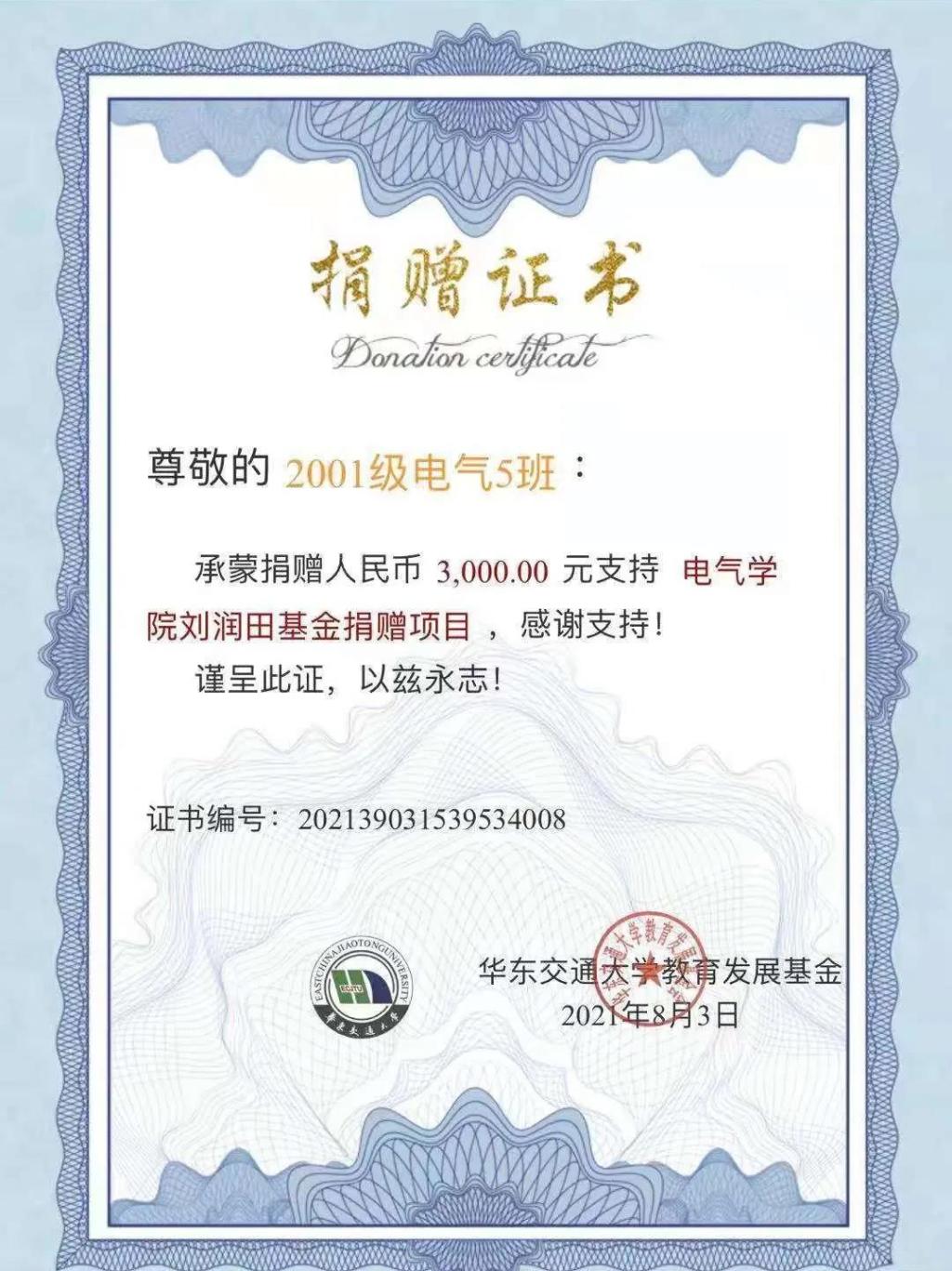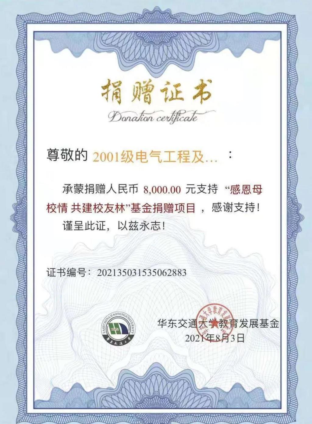 近日,2001级电气专业员工向学校捐赠了人民币8000元,以支持“感恩母校情 共建员工林”基金捐赠项目。2001级电气5班员工向学院捐赠了人民币3000元,以支持“356体育在线官网刘润田基金捐赠项目”。